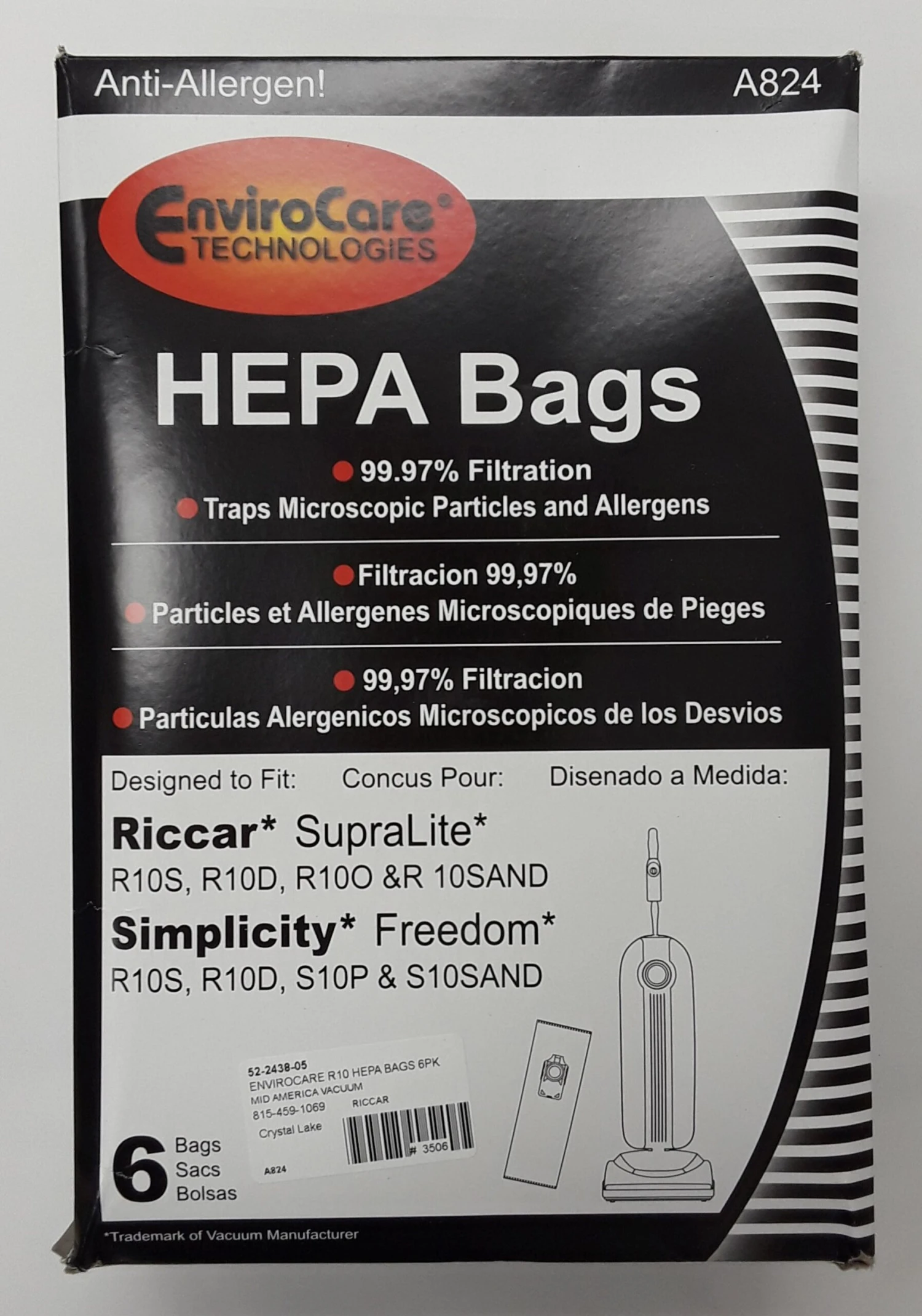 Generic Type R10 HEPA bags for Riccar SupraLite and Simplicity Freedom vacuum models with a self-sealing green bag collar.