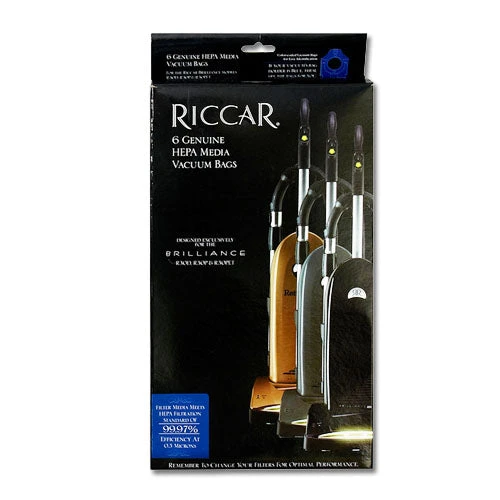 Genuine Riccar Type R30 Brilliance HEPA media vacuum bags designed to fit models with the blue self-sealing collar.